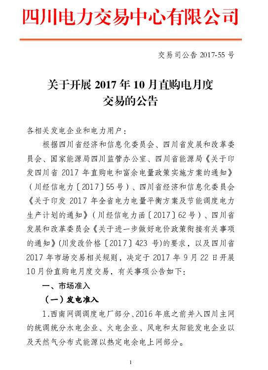 2017年9月21日四川電力交易中心發(fā)布《關(guān)于開展2017年10月直購電月度交易的公告》。公告中稱,用電企業(yè)按水火7:3參與直購電月度交易。根據(jù)用電企業(yè)申報(bào)情況,經(jīng)交易中心審核確定10月份月度交易總需求為1.89億千瓦時(shí)。各電力用戶10月水電交易電量上限等于其申報(bào)的10月電量需求的70%,已在交易系統(tǒng)預(yù)置,交易過程中,參與用電企業(yè)可在上限內(nèi)申報(bào)水電交易電量。