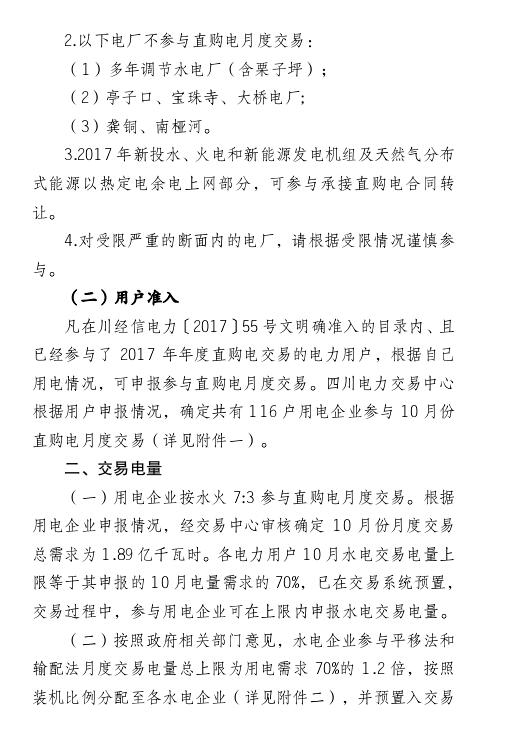 2017年9月21日四川電力交易中心發(fā)布《關(guān)于開展2017年10月直購電月度交易的公告》。公告中稱,用電企業(yè)按水火7:3參與直購電月度交易。根據(jù)用電企業(yè)申報(bào)情況,經(jīng)交易中心審核確定10月份月度交易總需求為1 89億千瓦