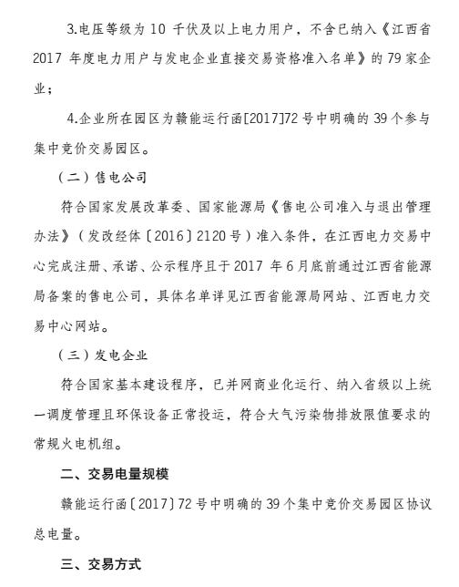 交易電量規(guī)模:贛能運(yùn)行函72號(hào)中明確的39個(gè)集中競(jìng)價(jià)交易園區(qū)協(xié)議總電量。