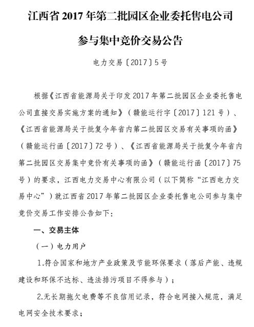 從江西電力交易中心獲悉,江西電力交易中心日前發(fā)布了關(guān)于江西省2017年第二批園區(qū)企業(yè)委托售電公司參與集中競(jìng)價(jià)交易公告。