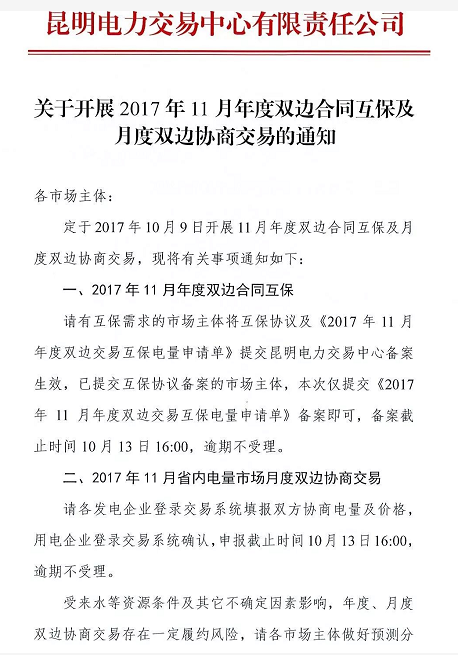 2017年9月29日,昆明電力交易中心發(fā)布通知。2017年10月9日將開(kāi)展2017年11月年度雙邊合同互保及月度雙邊協(xié)商交易。雙邊合同互保的材料備案截止時(shí)間為10月13日16:00;省內(nèi)電量市場(chǎng)月度雙邊協(xié)商交易申報(bào)截止時(shí)間10月