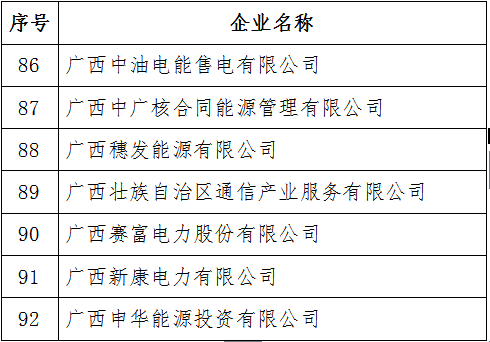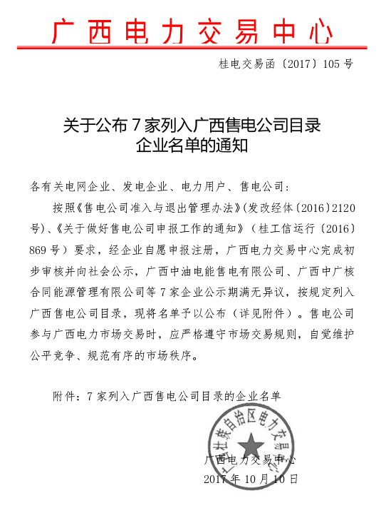 2017年10月10日,廣西中油電能售電有限公司、廣西中廣核合同能源管理有限公司等7家企業(yè)公示期滿無(wú)異議,按規(guī)定列入廣西售電公司目錄。詳情如下:附件:7家列入廣西售電公司目錄的企業(yè)名單