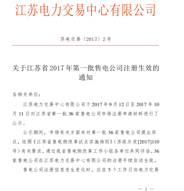 2017年10月12日,江蘇電力交易中心發(fā)布第一批售電公司注冊(cè)生效的通知。2017年9月12日-2017年10月11日,江蘇省對(duì)華能江蘇能源銷售有限責(zé)任公司、華能江蘇能源有限公司、國(guó)家電投集團(tuán)江蘇綜合能源供應(yīng)有限公司等第