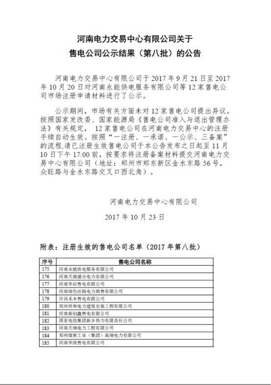 10月23日,河南電力交易中心公布售電公司公示結(jié)果(第八批)的公告,于2017年9月21日至2017年10月20日對河南永能供電服務(wù)有限公司等12家售電公司市場注冊申請材料進(jìn)行了公示,期間市場方面未對12家售電公司提出異議