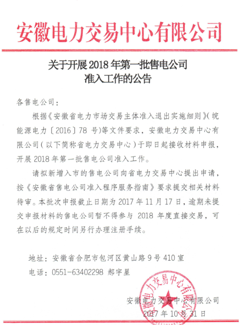 安徽《關(guān)于開(kāi)展2018年第一批售電公司準(zhǔn)入工作的公告》:逾期未提交申報(bào)暫不得參與2018年度直接交易