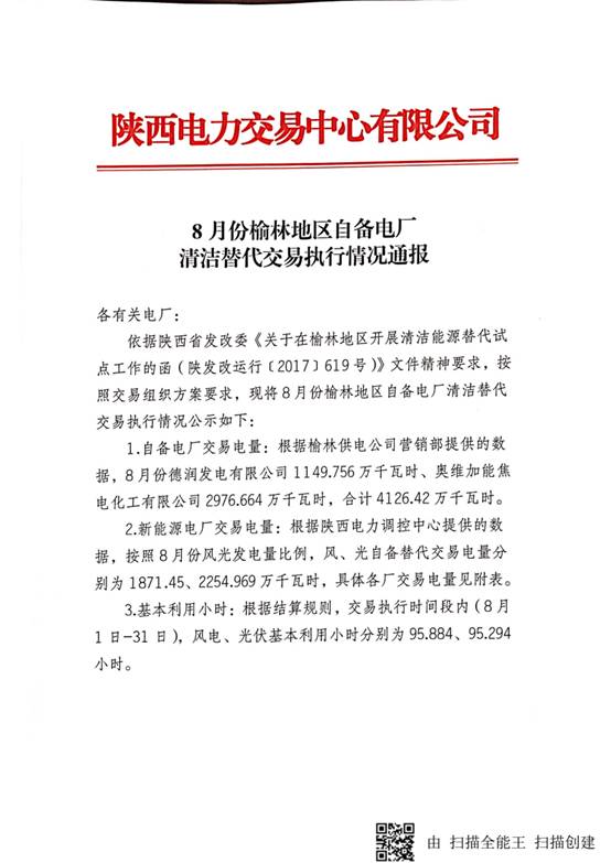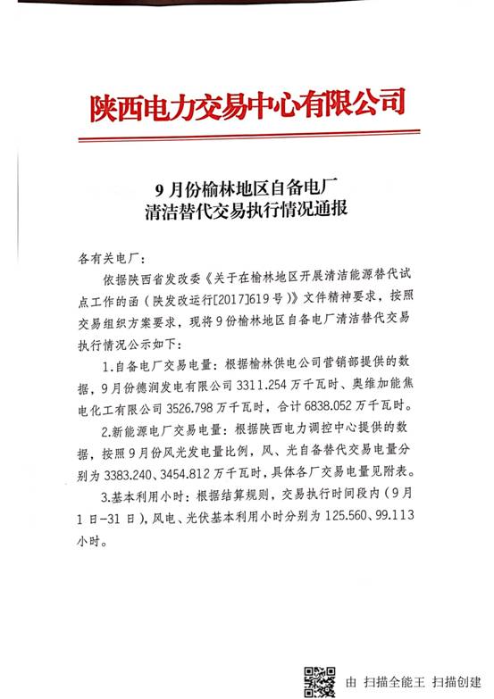 《7、8、9月份榆林地區(qū)自備電廠清潔能源交易執(zhí)行情況通報(bào)》