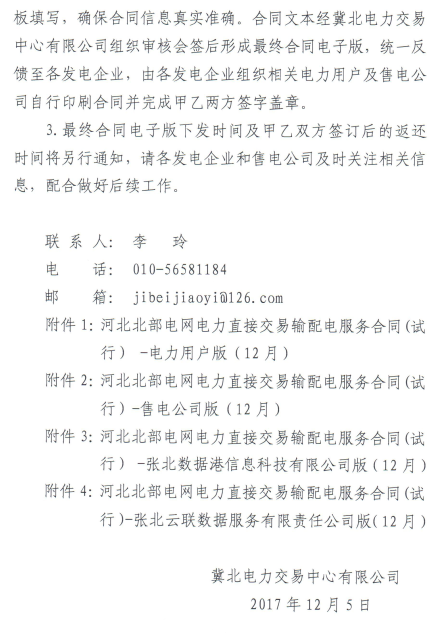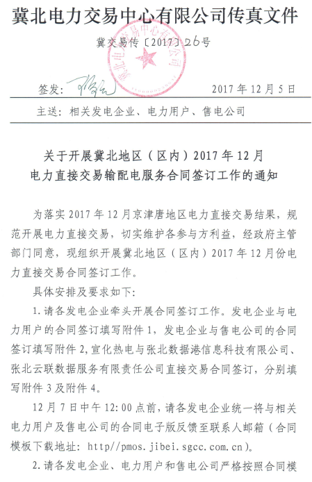 冀北發(fā)布《2017年12月電力直接交易輸配電服務(wù)合同簽訂工作的通知》