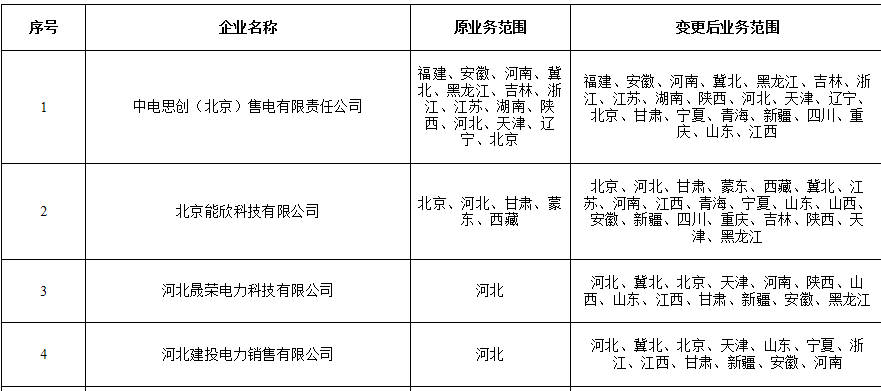 北京公示9家業(yè)務范圍變更的售電公司相關信息的公告