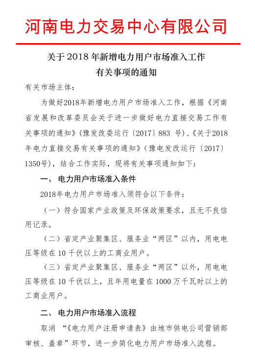 河南2018年新增電力用戶市場準入工作有關(guān)事項發(fā)布