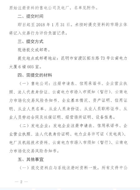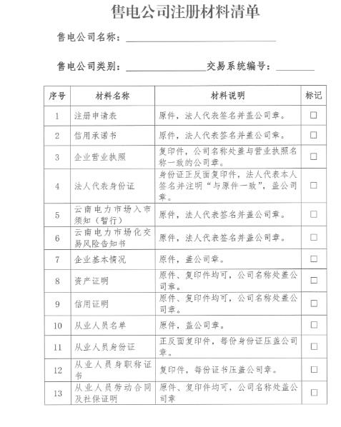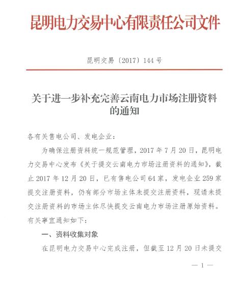 云南昆明進(jìn)一步完善電力市場(chǎng)注冊(cè)資料的通知