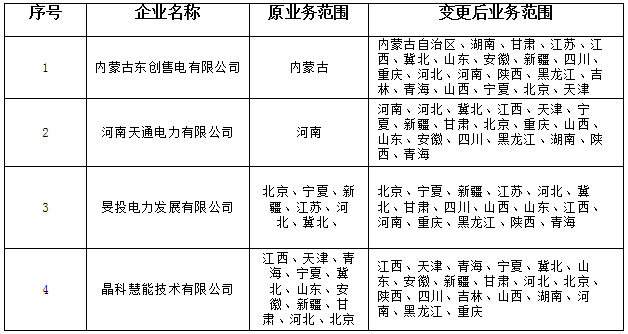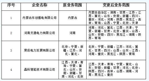 按照國家發(fā)改委、國家能源局《售電公司準(zhǔn)入與退出管理辦法》的要求,北京電力交易中心受理了下列4家涉及山西省有關(guān)業(yè)務(wù)售電公司的業(yè)務(wù)范圍變更申請,并對售電公司提交的市場準(zhǔn)入申請材料進(jìn)行了完整性核驗(yàn)且予以公示。按照北京電力交易中心要求,現(xiàn)在我省予以公示。