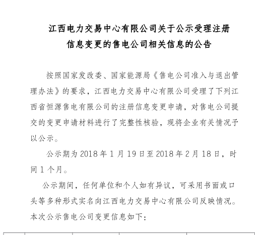 江西電力交易中心日前受理了江西省恒源售電有限公司的祖冊信息變更申請,現(xiàn)將企業(yè)有關(guān)情況予以公示。公示期為20181月19日至2018年2月18日,