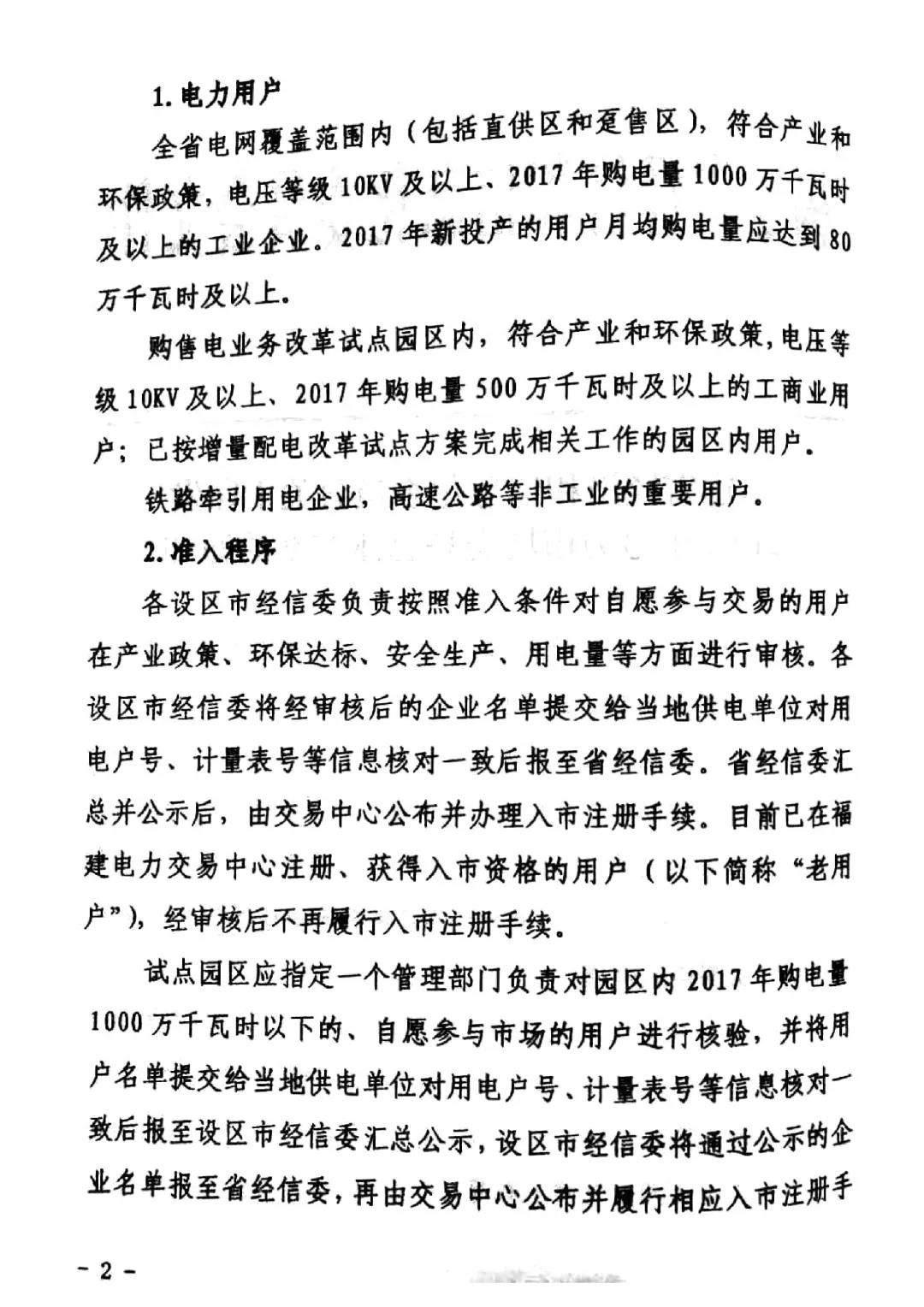 電力用戶:全省電網(wǎng)覆蓋范圍內(nèi)(包括直供區(qū)和躉售區(qū)),符合產(chǎn)業(yè)和環(huán)保政策,電壓等級10KV及以上、2017年購電量1000萬千瓦時及以上的工業(yè)企業(yè),2017年新投產(chǎn)的用戶月均購電量應(yīng)達(dá)到80萬千瓦時及以上。