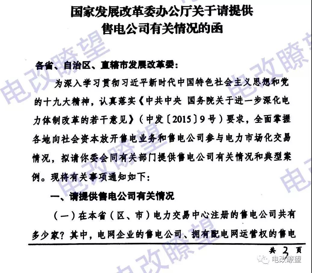 據(jù)電改瞭望微信號,國家發(fā)改委辦公廳日前發(fā)布了《關(guān)于請?zhí)峁┦垭姽居嘘P(guān)情況的函》,要求提供在本省電力交易中心注冊的售電公司共有多少家