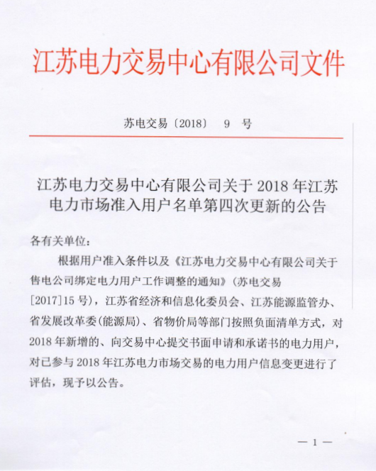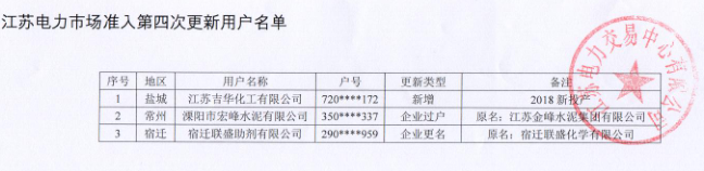 江蘇電力交易中心日前發(fā)布了《關(guān)于2018年江蘇電力市場準(zhǔn)入用戶名單(第四次更新)》,名單中包含3家電力用戶。詳情如下: