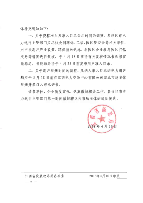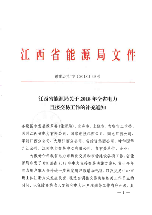江西2018年全省電力直接交易工作的補(bǔ)充通知