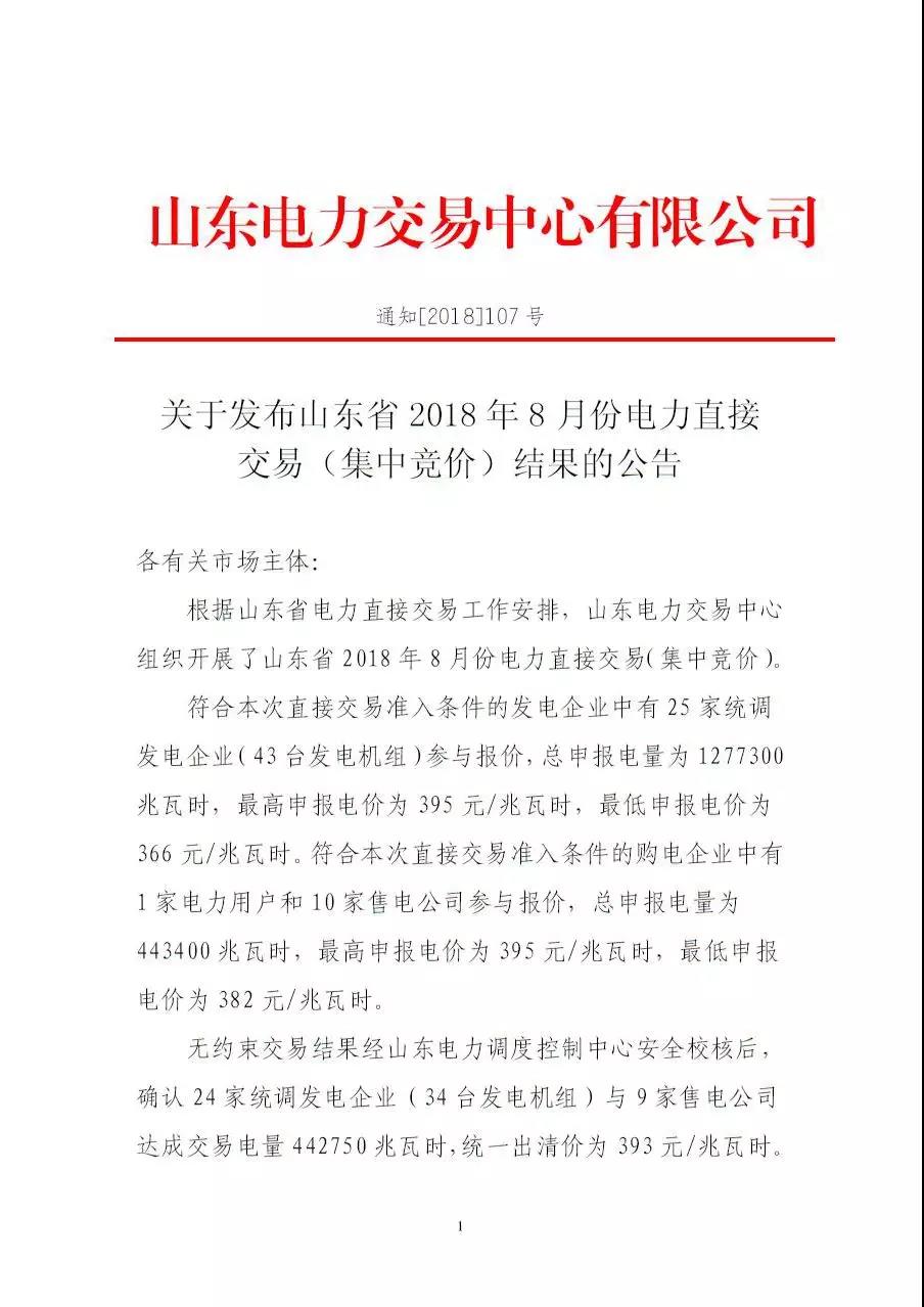 山東省2018年8月份電力直接交易(集中競價)結(jié)果