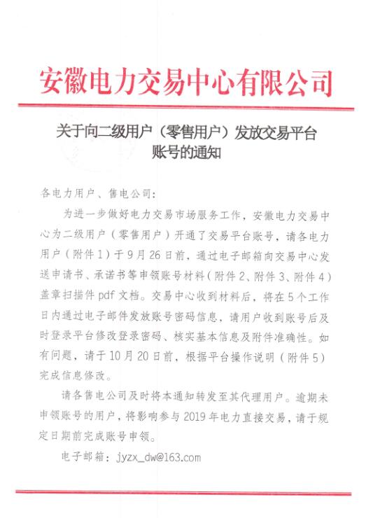 安徽電力交易中心日期發(fā)布了《關(guān)于向二級用戶(零售用戶)發(fā)放賬號的通知》,安徽電力交易中心為二級用戶(零售用戶)開通了交易平臺賬號,各電力用戶(附件1)需在9月26日前,通過電子郵箱向交易中心發(fā)送申請書、承諾書等申領(lǐng)賬號材料(附件2、附件3、附件4)蓋章掃描件pdf文檔。