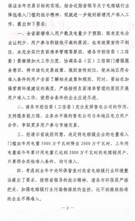 決定將電熔鎂企業(yè)的電量準入門檻由年用電量5000萬千瓦時降至2000萬千瓦時,上年用電量或今年累計用電量已達到2000萬千瓦時的電熔鎂用戶只要符合其他準入條件,均可準入。