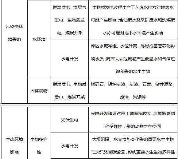 4、生態(tài)環(huán)境影響:煤礦開采造成采空塌陷區(qū),導致土壤龜裂,山體滑坡,水資源流失,耕地毀壞;光電開發(fā)占用土地面積較大,影響動物生存空間,對物種多樣性有一定影響;水電開發(fā)造成水文情勢變化,影響水生生物“三場”及洄游通道,影響水生生物多樣性;風電開發(fā)風機可能對鳥類的覓食、休憩和遷飛等活動行為產生一定的不利影響。