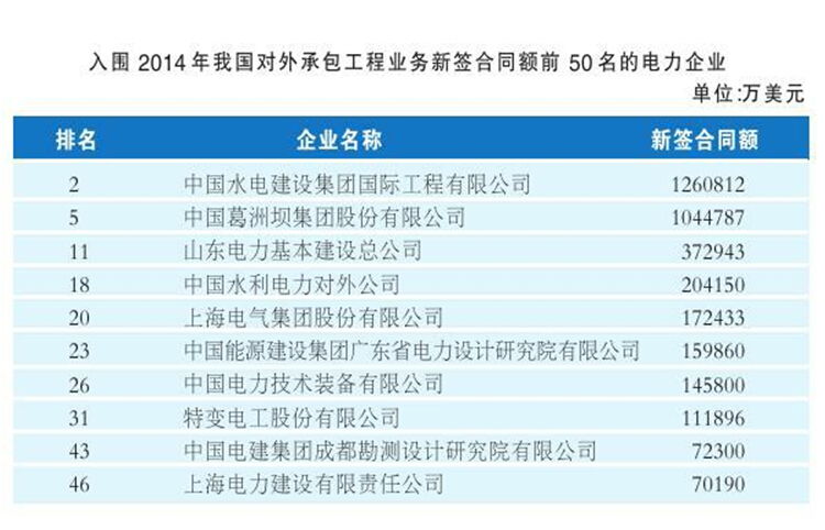 在“2014年我國對(duì)外承包工程業(yè)務(wù)新簽合同額前50家企業(yè)”名單中,中國電力建設(shè)股份有限公司以1260812萬美元位居第二位,中國電建集團(tuán)所屬山東電力基本建設(shè)總公司位列第11,成都勘測設(shè)計(jì)研究院有限公司位列第43,上海電力建設(shè)有限責(zé)任公司位列第46。中國能建集團(tuán)所屬中國葛洲壩集團(tuán)股份有限公司位列第五位,廣東省電力設(shè)計(jì)研究院有限公司位列第23。