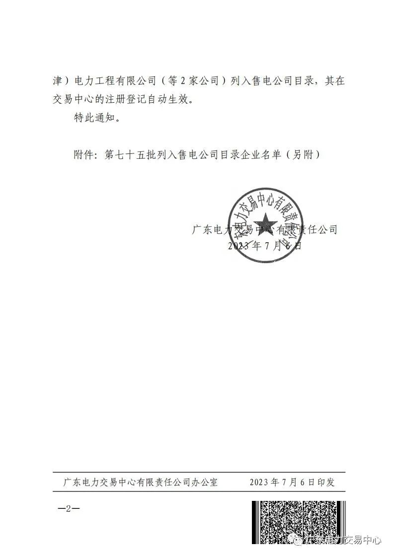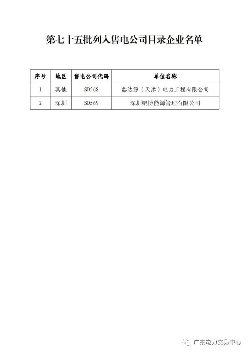日前廣東電力交易中心公布第七十五批列入售電公司目錄企業(yè)名單。詳情如下:<