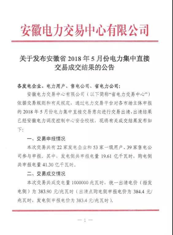 安徽電力交易中心日前發(fā)布了《安徽省2018年5月份電力集中直接交易成交結(jié)果的公告》,公告中稱,本次交易共成交電量1000000兆瓦時(shí),統(tǒng)一出清...