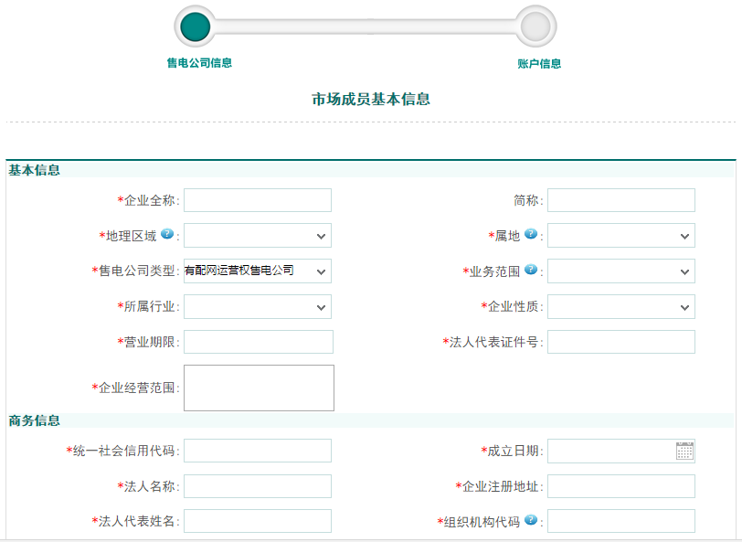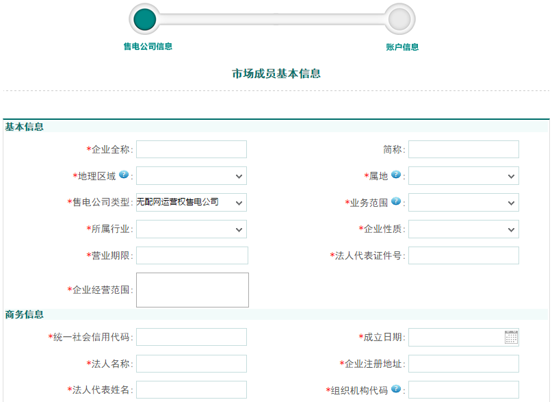 (2)如果售電企業(yè)無配網(wǎng)運(yùn)營權(quán),則頁面上不顯示電力業(yè)務(wù)許可證編號、配電網(wǎng)基本信息,同時也無需上傳電力業(yè)務(wù)許可證掃描件了,從業(yè)人員信息需要填至少10個。