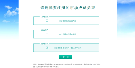 選擇售電公司,點擊后會自動下載售電公司信用承諾書,然后點擊下一步進(jìn)行售電企業(yè)注冊。需要注意的是,下載的信用承諾書,需要打印并簽字蓋章,最后掃描成電子件PDF格式,提交注冊信息時作為附件信息一并提交。