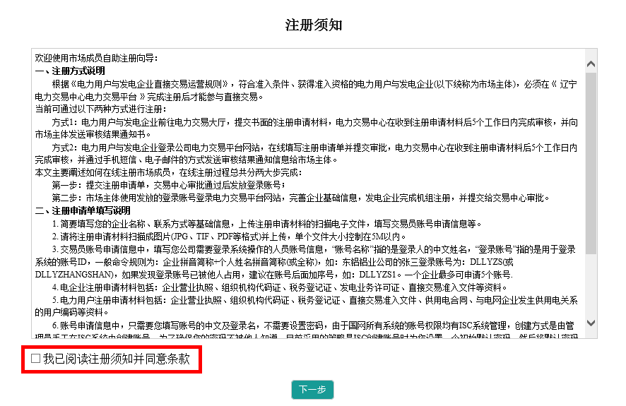 在打開的注冊須知頁面,需完整閱讀注冊須知后,勾選“我已閱讀注冊須知并同意條款”,并點擊下一步。如下圖2所示: