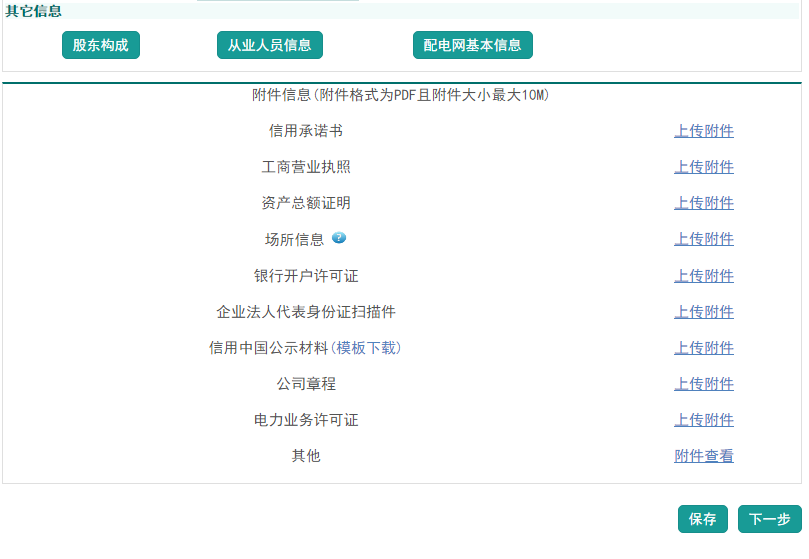 用戶需要首先填寫市場成員的基本信息,包括基本信息、商務(wù)信息、聯(lián)系信息、其他信息等。然后上傳要求的全部附件信息,附件文件類型必須為pdf格式,文件名為公司名稱+文件內(nèi)容,點擊保存并下一步。