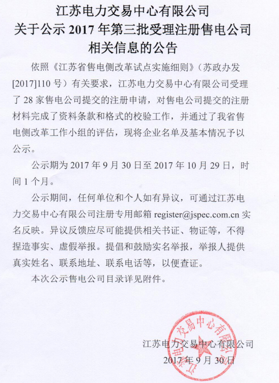 2017年9月30日,江蘇電力交易中心發(fā)布公告。江蘇電力交易中心有限公司受理了28家售電公司提交的注冊申請,將企業(yè)名單及基本情況予以公示,公示期為2017年9月30日至2017年10月29日。至此江蘇電力交易中心9月已公示