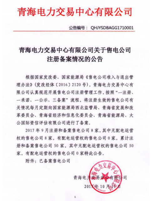 2017年10月10日,青海電力交易中心發(fā)布售電公司注冊備案情況的公告。2017年9月青海省注冊和備案售電公司8家,其中無配電運(yùn)營權(quán)的售電公司8家,有配電運(yùn)營權(quán)的售電公司0家。青海省累計(jì)注冊和備案售電公司50家,其