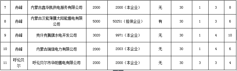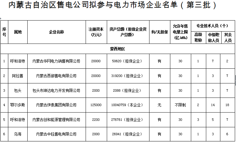 內(nèi)蒙古第三批30家售電公司參與電力市場公示名單