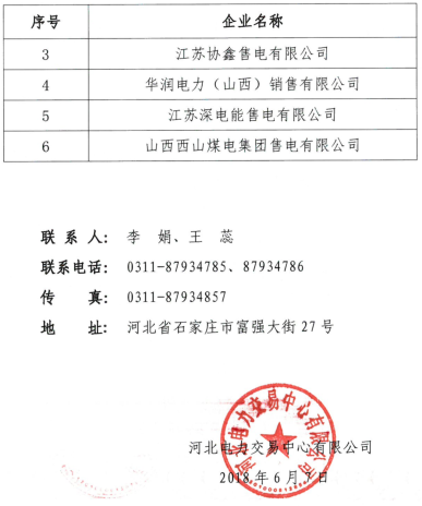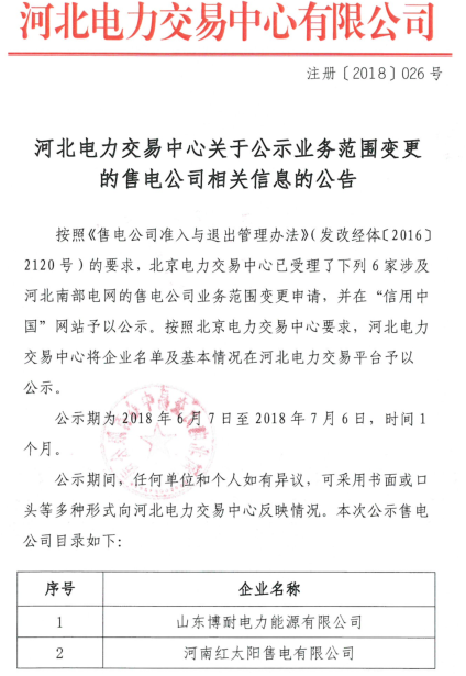 河北公示業(yè)務范圍變更的6家售電公司
