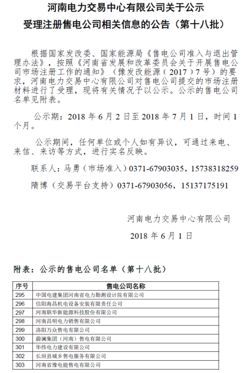 河南電力交易中心日前發(fā)布了《關(guān)于公示受理注冊售電公司相關(guān)信息的公告(第十八批)》,本批次共公示了14家售電公司,公示期為2018年6月2日至