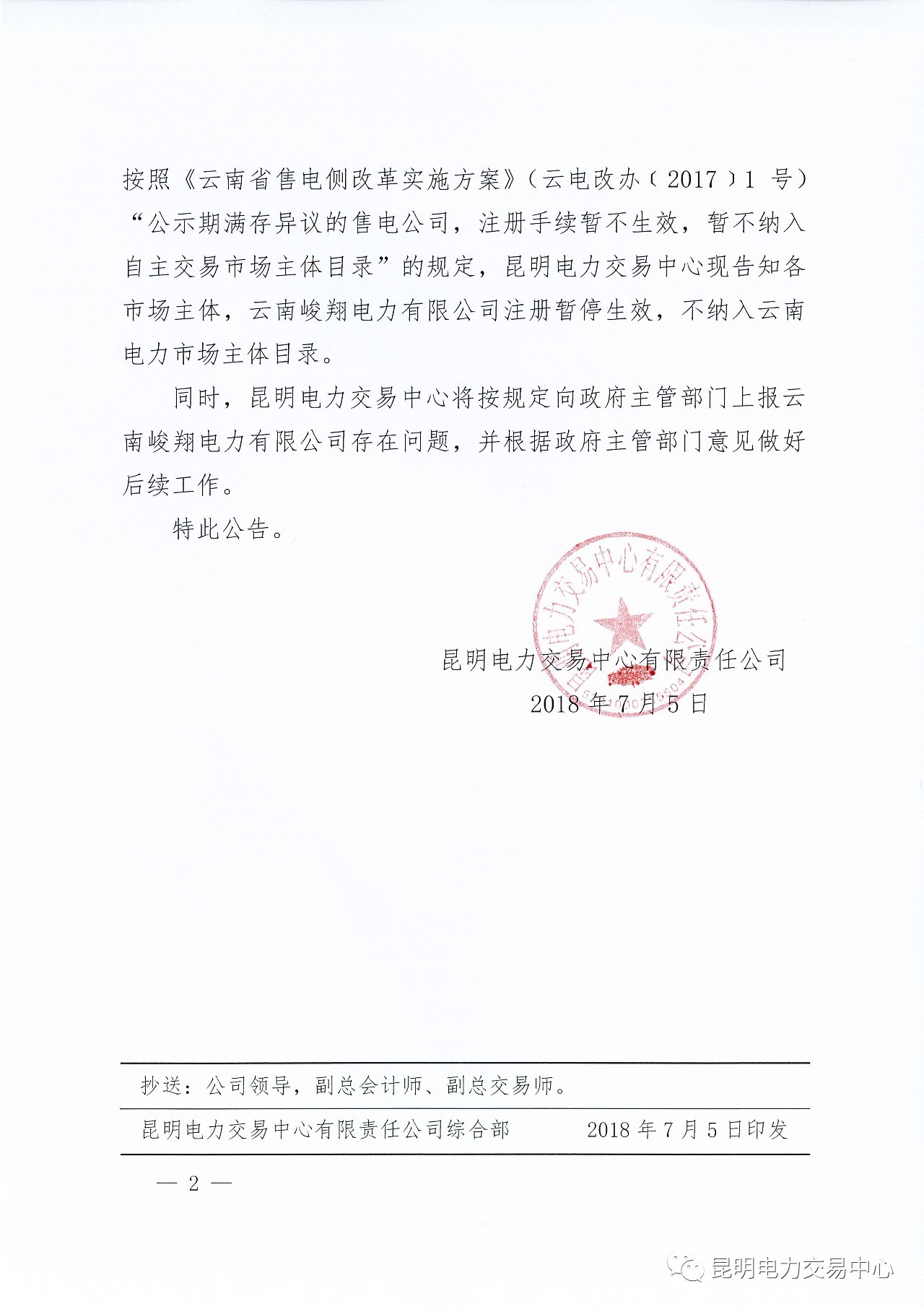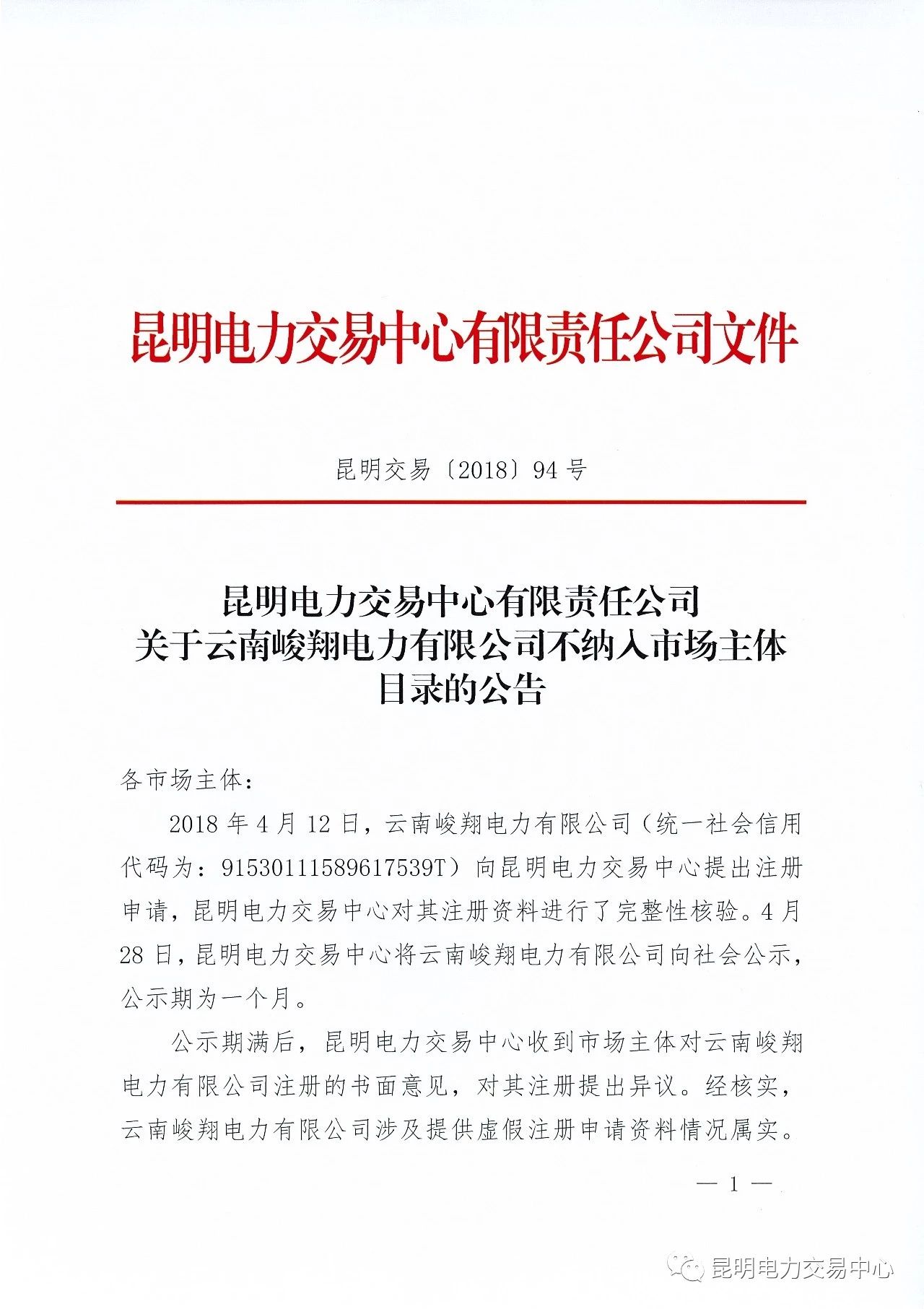昆明電力交易中心日前發(fā)布了《昆明電力交易中心有限責(zé)任公司關(guān)于云南峻翔電力有限公司不納入市場(chǎng)主體目錄的公告》,經(jīng)核實(shí)云南峻翔電力有限
