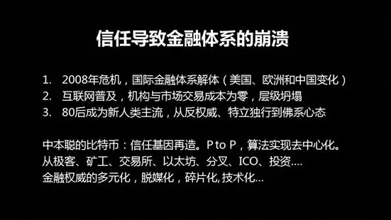 我簡單說一下歷史,為什么區(qū)塊鏈這么火?是有社會背景的,有三個(gè),第一08年金融危機(jī)以后,導(dǎo)致國際金融體系迅速崩潰,全世界不相信美國,不相信華爾街了,歐洲也不行了,導(dǎo)致全世界的世界金融秩序的質(zhì)疑,這是區(qū)塊鏈大發(fā)展的最主要的原因。第二,互聯(lián)網(wǎng)普及了,有了互聯(lián)網(wǎng)交易成本便為0,沒有什么層級,任何偉大的思想不用通過教授、教師、學(xué)生,所以鄧迪他們比我強(qiáng),鄧迪是我的老師,我四年前認(rèn)識他,他給我講元寶幣,我經(jīng)常向他學(xué)習(xí),他們這批80后能夠帶我們玩兒那是我們的榮幸,你還能感受到市場前沿,否則根本不帶你玩了。我們當(dāng)年像他這個(gè)歲數(shù)的時(shí)候,看著50多歲的人壓著我們心里也是很蹉火。第三,80后是現(xiàn)在的主力,他們是反權(quán)威,特立獨(dú)行,90后是佛系社會。很多人投資加密幣,是風(fēng)險(xiǎn)投資的心態(tài),他們比我們這一代有錢,有選擇能力和承擔(dān)風(fēng)險(xiǎn)能力。不必太替他們操心,許多人一下虧了幾十萬,無非是被割韭菜的快感。我們苦口婆心說他,他要嘗試,要失敗,這個(gè)心態(tài)完全重要,我們要聽他們的,在座現(xiàn)在有很多老板都知道,我們的孩子都比我們強(qiáng),確實(shí)是這樣。