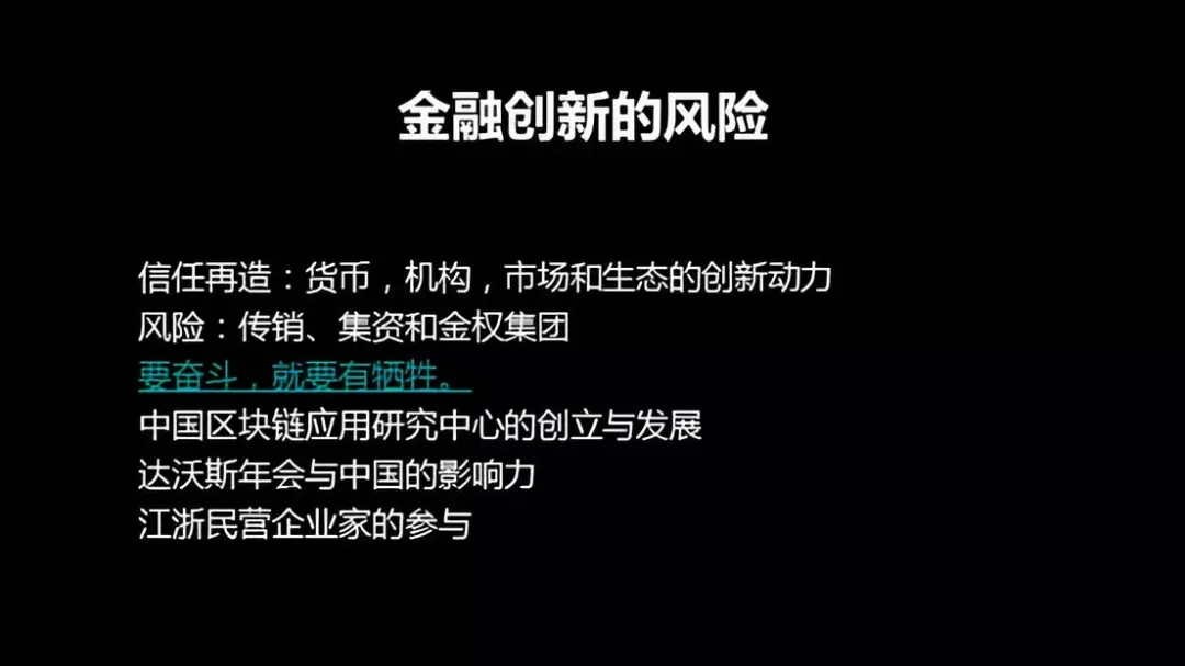 風(fēng)險(xiǎn)當(dāng)然會存在。第一是底層傳銷,高層叫社會非法集資,再高層次是權(quán)貴集團(tuán)。習(xí)近平主席不斷強(qiáng)調(diào)金融風(fēng)險(xiǎn)是最大的風(fēng)險(xiǎn),因?yàn)樗ツ曛v了四次,今年三大任務(wù)攻堅(jiān)戰(zhàn)第一個(gè)就是金融安全和金融風(fēng)險(xiǎn),因?yàn)槌霈F(xiàn)了一大堆的風(fēng)險(xiǎn),系統(tǒng)性都會有。但是今天進(jìn)入?yún)^(qū)塊鏈,炒幣確實(shí)形成風(fēng)險(xiǎn),這是我們要關(guān)注的,也是監(jiān)管機(jī)構(gòu)嚴(yán)厲打擊的,我們創(chuàng)新要守住底線。