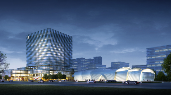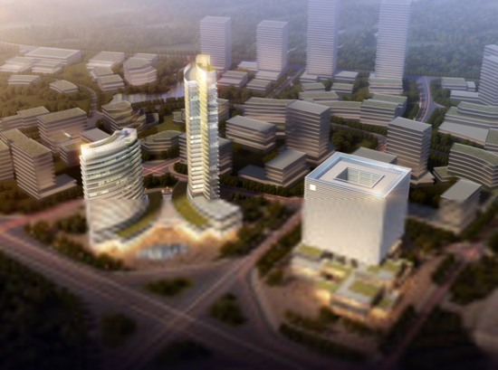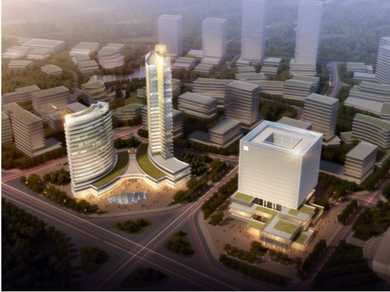 智慧谷項目建筑物上,以荔波大小七孔橋為參考,打造現(xiàn)代的建筑群落,體現(xiàn)了中國傳統(tǒng)文化中“天圓地方”的寓意。高速路入口處的主體酒店和辦公樓區(qū),以弧形狀的有機形態(tài)來展示自然和科技的奧妙,以矩形方體元素衍生出的簡約而豐富的體量和空間組合很好的闡述了這一寓意。