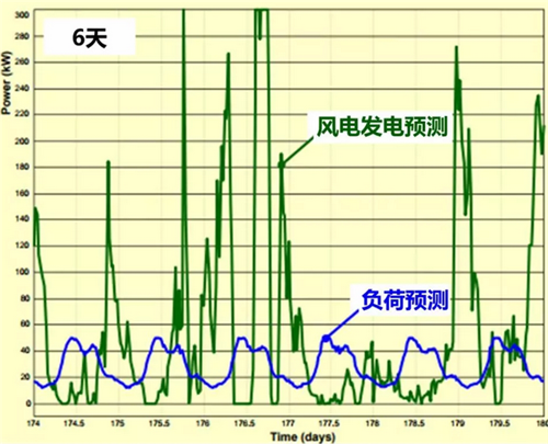 這個項目的HECS設(shè)備能夠提供每年250兆瓦時的電力和將近6500千克的氫氣。一部分氫氣通過燃料電池為附近的一個辦公建筑提供足夠的電力,這棟建筑中午的峰值負(fù)荷能夠達(dá)到50KW,全年用電量在250兆瓦左右。為了能夠制定出最優(yōu)的風(fēng)電充放電策略,該系統(tǒng)配備了一套風(fēng)力發(fā)電預(yù)測系統(tǒng)和負(fù)荷預(yù)測系統(tǒng),一個通過該系統(tǒng)計算出的6天風(fēng)電發(fā)電功率和負(fù)荷的如下: