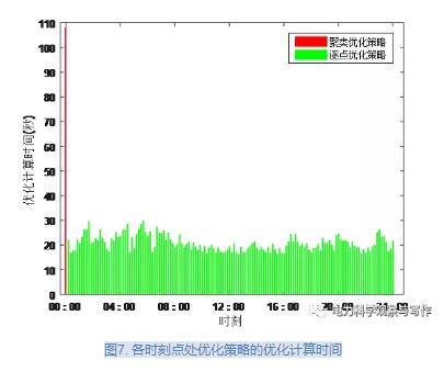 兩優(yōu)化策略的仿真平臺為臺式電腦(Intel-i3 3.60 GHz, 4 GB RAM)和MATLAB R2015a,兩優(yōu)化策略的優(yōu)化計算時間如圖7所示??梢钥吹?,聚類優(yōu)化策略僅需在風電機組投運前(00 : 00時刻)優(yōu)化計算各風速聚類中心下的優(yōu)化控制策略,而在風電機組投運后,僅需根據(jù)當前測量風速,選擇對應聚類中心的優(yōu)化控制策略,該過程僅涉及選擇判斷操作,因此可快速實現(xiàn)。逐點優(yōu)化策略則需在每時刻點進行半分鐘左右的優(yōu)化計算。兩者相比,聚類優(yōu)化策略更適用于風電機組功率的實時優(yōu)化。