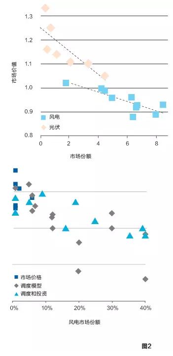 因此,這種情況下,風(fēng)電與化石能源發(fā)電,將成為具有明顯區(qū)別的兩種產(chǎn)品。在30%的份額下,風(fēng)電的價(jià)值可能只有市場(chǎng)平均電力價(jià)格的50%-80%了(圖2)。其市場(chǎng)的最優(yōu)份額,取決于其自身的成本與其相應(yīng)價(jià)值的比較,而不是彼此間的比較(比如基于度電成本)。