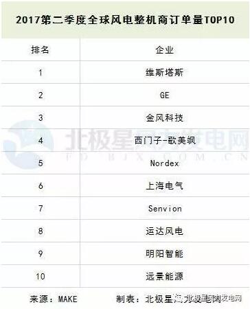 2017年第二季度全球風(fēng)電整機商訂單量前三名為維斯塔斯、GE、金風(fēng)科技,入圍全球Top10的中國風(fēng)電整機商有5家:金風(fēng)科技(3)、上海電氣(6)、運達風(fēng)電(8)、明陽智能(9)、遠景能源(10)。上半年全球風(fēng)電整機商訂單量前三名為維斯塔斯、西門子-歌美颯、GE,入圍全球Top10的中國風(fēng)電整機商有3家:金風(fēng)科技(4)、上海電氣(7)、明陽智能(9)。