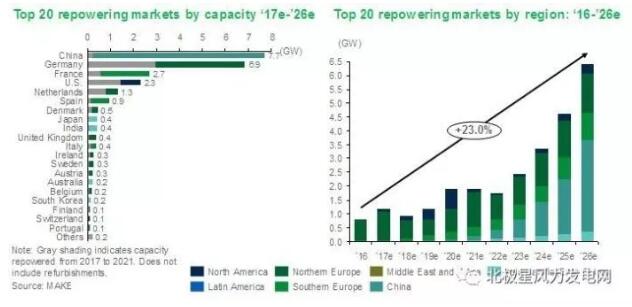 據(jù)MAKE預(yù)測,2017-2026年中國風(fēng)電改造市場容量達7.7GW,居全球第一位。緊隨其后的是德國、法國、美國,分別為:6.9GW、2.7GW和2.3GW。