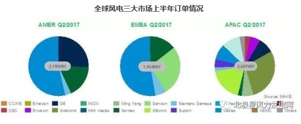 據(jù)MAKE數(shù)據(jù)統(tǒng)計,2017年第二季度美洲風(fēng)電市場訂單量為2.15GW,市場份額最大的為維斯塔斯;歐洲、中東及非洲市場訂單量為1.934GW,市場份額最大的是維斯塔斯;亞太市場訂單量為3.487GW,市場份額最大的是金風(fēng)科技。