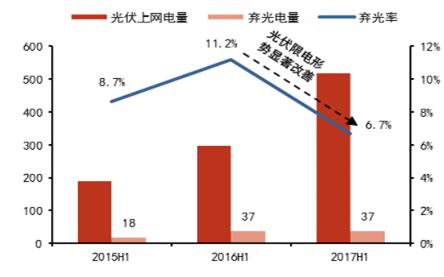 2015H1-2017H1 全國光伏棄光限電情況(億千瓦時)