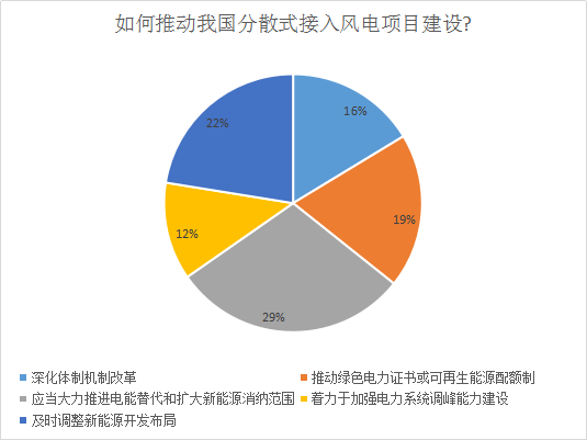 日前,中國電力新聞網(wǎng)以及中電傳媒微博、微信、論壇發(fā)起關于“如何推動我國分散式接入風電項目建設”的數(shù)據(jù)調查活動。12%的受訪者認為,應當著力于加強電力系統(tǒng)調峰能力建設;16%的受訪者認為應當深化體制機制改革;19%的受訪者認為應該以推動綠色電力證書為突破口;22%的受訪者認為應當及時調整新能源開發(fā)布局;29%的受訪者認為,應當大力推進電能替代和擴大新能源消納范圍等措施。