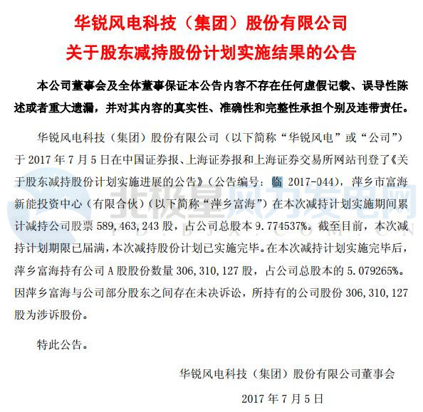北極星風(fēng)力發(fā)電網(wǎng)獲悉,華銳風(fēng)電股東萍鄉(xiāng)富海7月5日完成減持589,463,243股,占公司總股本 9 774537%。以下為公告原文: