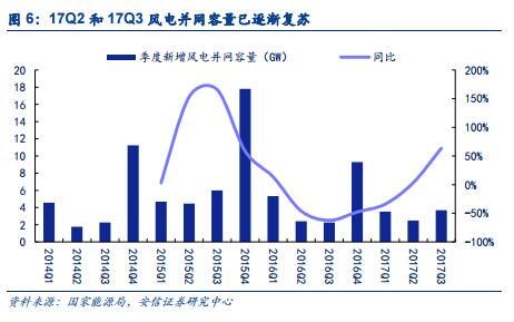 事實上,當前行業(yè)需求已連續(xù)兩季復蘇。根據能源局數據,2017 年 Q1-Q3,風電并網裝機分別為 3.52GW、2.49GW、3.69GW,分別同比增長-33.96%,3.32%、63.27%,風電并網數據已連續(xù)兩個季度轉正,且三季度大幅增長。